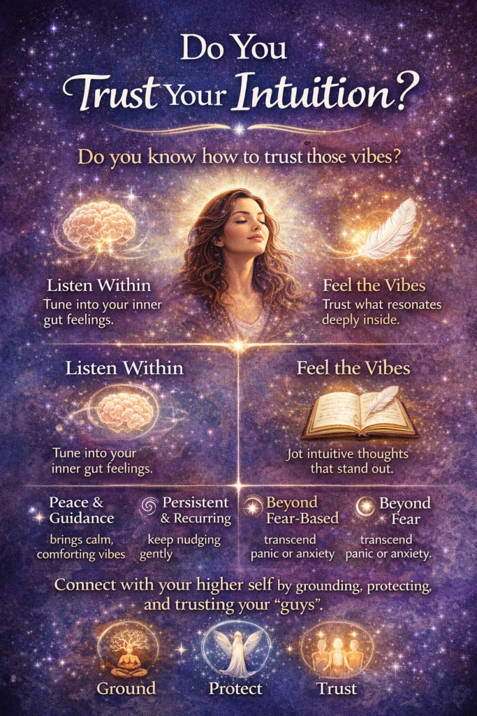 I believe we are all spiritual beings having human experiences. We have come to learn lessons that our soul has not learned from past life experiences. We all get those inner gut feelings whether you believe in the above statement or not. What happens when you trust those inner gut feelings? What happens when you do not? Would you like to have a better understanding as well as faith to trust those vibes or your own intuition without fear and outside opinions? Then by all means read on!