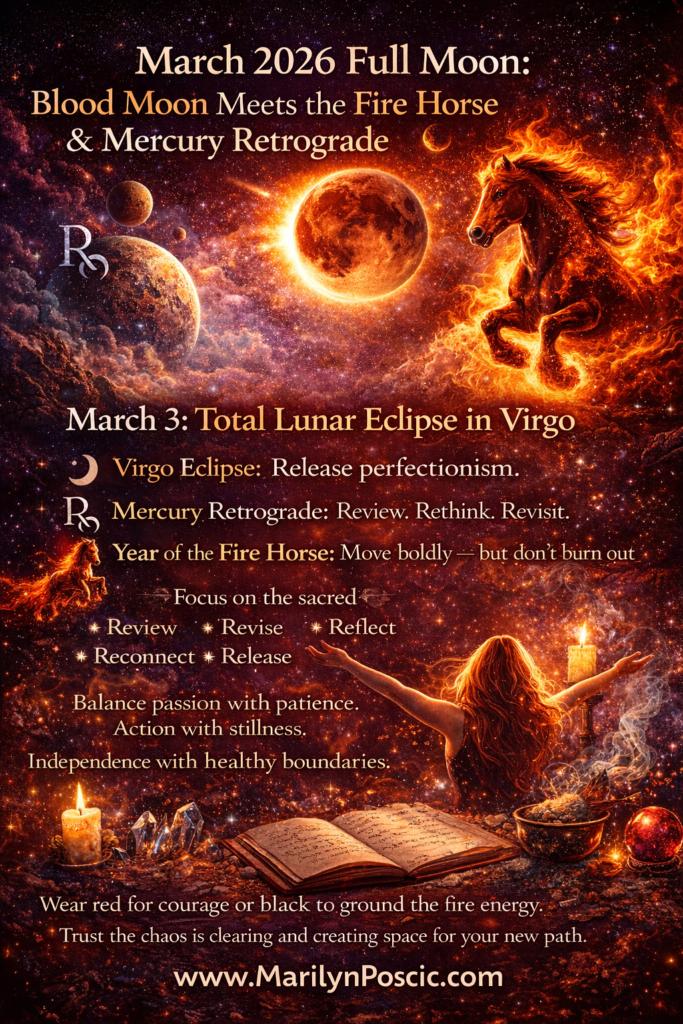 The Full Moon on March 3, 2026, is a Total Lunar Eclipse (Blood Moon) in Virgo, occurring during the high-energy Year of the Fire Horse (which began February 17, 2026) and coinciding with Mercury Retrograde in Pisces (February 26 – March 20). This combination creates an intense, chaotic, and transformative period that demands a balance between rapid action, emotional release, and careful communication. The key to navigating this period is to embrace the “Re-” activities—review, revise, rethink, and redecorate—rather than forcing new beginnings.